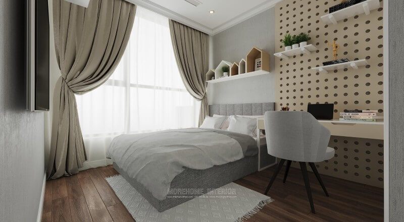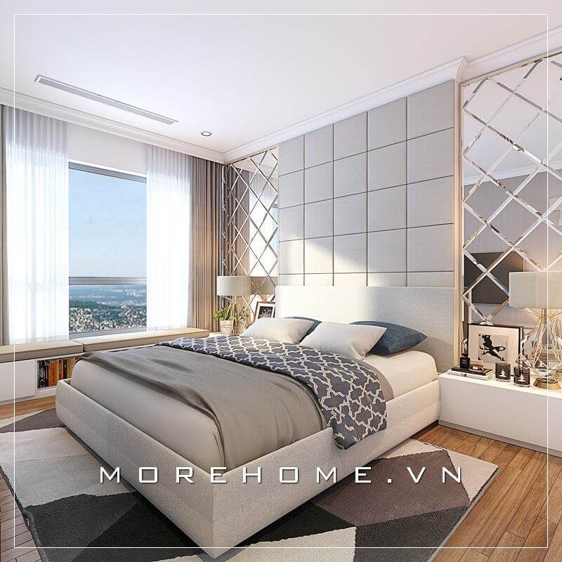 Giường ngủ bọc vải màu xám tinh tế, nhẹ nhàng mà không kém phần ấn tượng