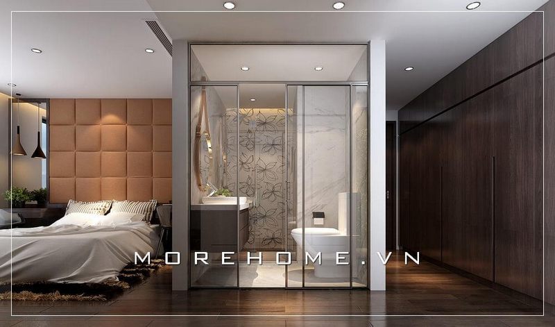 Thiết kế nội thất giường ngủ cao cấp cho căn hộ chung cư với đầu giường được bọc đệm da phong cách hiện đại và tinh tế.