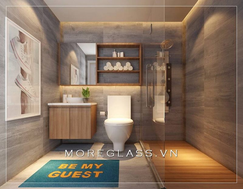 Mẫu phòng tắm đẹp, đơn giản và tiện nghi được trang bị vách ngăn kính cường lực cao cấp giúp ngăn chặn nước không bị hắt sang không gian xung quanh.